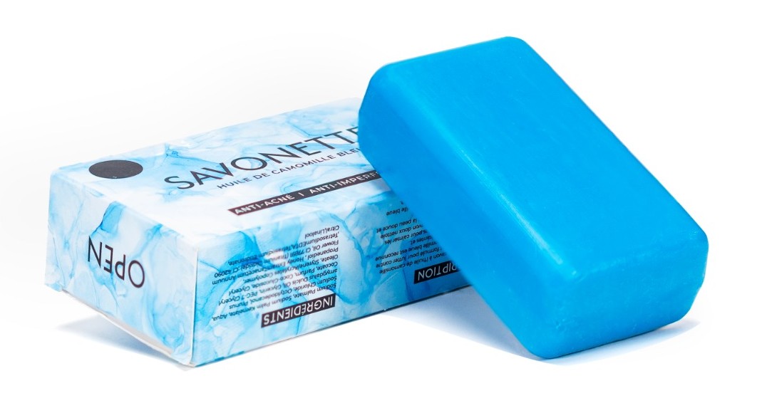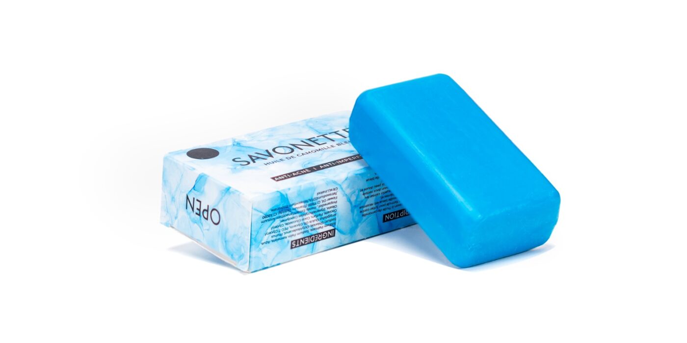 Découvrez notre savon à l’huile de camomille bleu,spécialement formulé pour lutter contre l’acné.